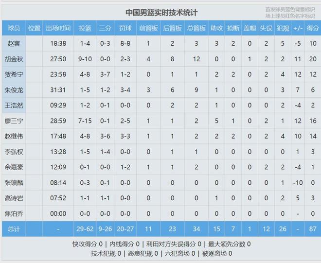 中国男篮完成15分大逆转,5打8依然拿下比赛,好样的!胡金秋20分12板、廖三宁16分5助、赵继伟14分2板2助2断、贺希宁12分2助2断、赵睿10分3板3助2断!最后看看数据,说说你的感受: