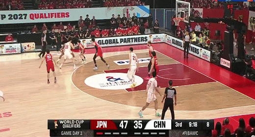 贺希宁强拔三分追至个位数!中国男篮38-47日本