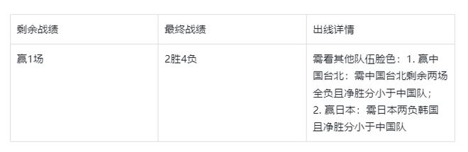 中国队的1胜若赢在日本男篮身上(两负中国台北队),中国台北男篮则能3胜晋级,中国队想晋级就必须满足日本队两负韩国男篮(韩国4胜晋级),同时净胜分小于中国队。