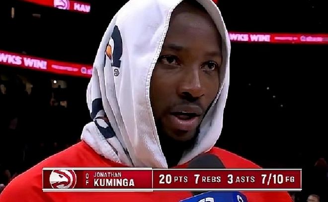 罚球时,老鹰球迷齐声高喊“谢谢勇士”。主场解说员也跟着起哄:“感谢勇士,谢谢你们放弃了如此年轻且有能力的库明加。”
