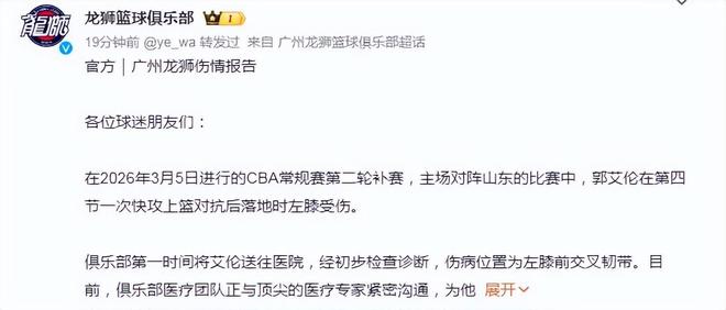 伤后俱乐部第一时间将艾伦送往医院,经初步检查诊断,伤病位置为左膝前交叉韧带。而郭艾伦本人深夜也自宣伤情:“在医院出来了,前交叉韧带断了,今天知道电视里演的有的不对,人在最难过绝望的时候,不是一直哭,哭完是会笑的。”尽管遭受重创,听艾伦的口吻还保持着一丝乐观的心态,那就是除了哭还有笑。