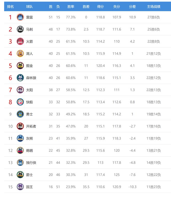 今日比赛后掘金、森林狼排名互换,鹈鹕、独行侠排名互换,其他西部球队排名不变。