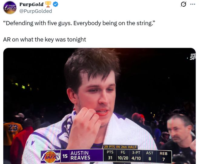 湖人另外一名核心里夫斯谈到湖人近期防守变化时也持有相同观点:“5个人一起防守,所有人都像串在一根绳上一样联动。”
