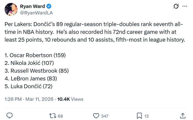 这是东契奇加盟湖人仅一个赛季第6次拿下30+三双,成功超越名宿科比,独占湖人队史第五。