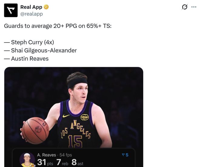 本赛季里夫斯可谓是高产又高效,场均可以轰下23.7分,真实命中率高达65.1%,是NBA历史上第三位做到这一点的后卫球员,另外两人是库里(4次)和亚历山大,可见这一项纪录的含金量之高。
