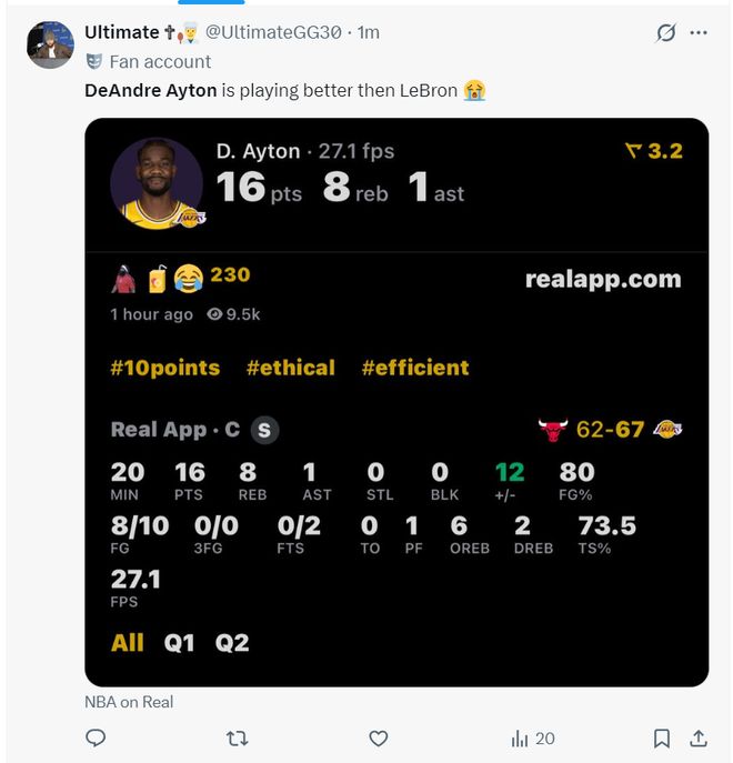 众所周知此前艾顿跟湖人教练组闹出了一些不和流言(不愿意当卡佩拉那样的蓝领),雷迪克一度让他的轮换时间不如海斯,艾顿也曾表达不满,他上一次拿到20+的比赛还要追溯到2月25日。或许艾顿与自己达成和解,他这场比赛非常积极主动。