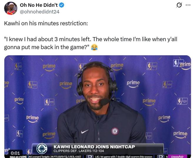 在因伤连续缺席东部三连客后,本场小卡火线复出,用行动证明自己伤病问题不大,同时状态依旧在线,这对于快船队来说自然是天大的好消息。