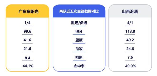 广东队近期取得两连胜,暂居联盟第三。山西队在上一轮不敌深圳后,位列第八。回顾双方上次交手,广东队在激烈对抗下利用极具压迫力的防守成功限制住了对手外线火力,最终依靠集体力量顶住反扑,客场拿下胜利。此番再战,山西队在首回合失利且张宁和焦海龙缺阵的情况下想必会做出针对性调整,再度出击,广东队需慎防对手变阵,充分准备,做好应变。