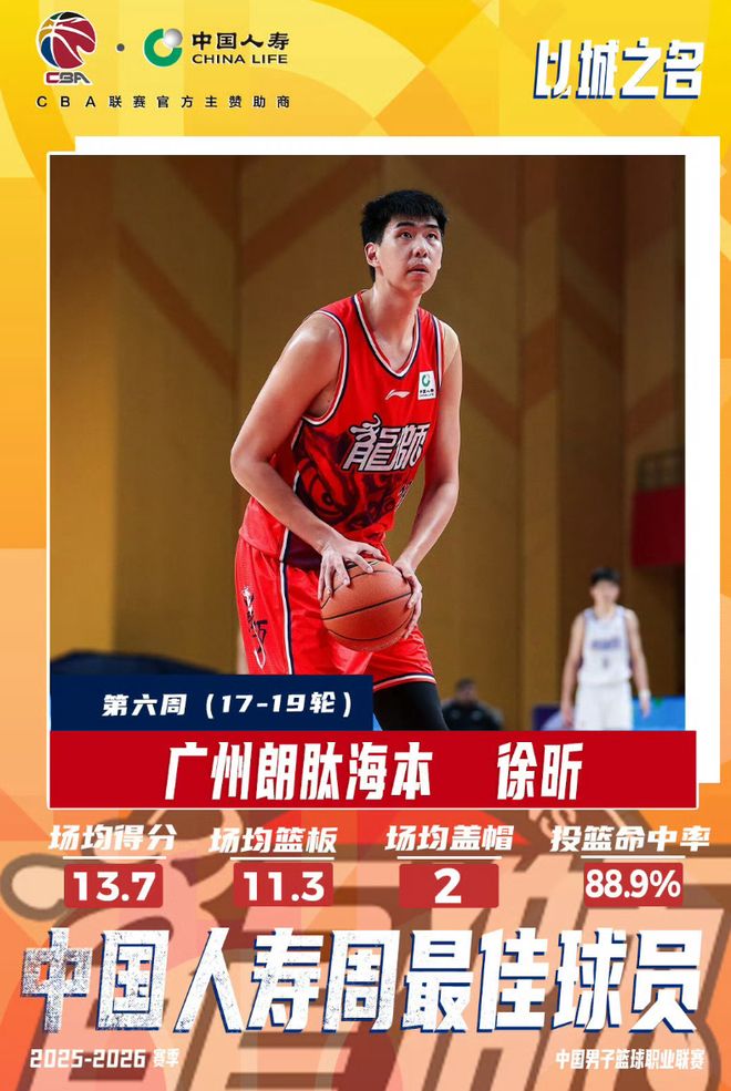 正因为有这样精彩的表现以及对于比赛胜负的巨大影响力,徐昕在1月24日入选了本赛季CBA第18轮常规赛的最佳五人阵容。