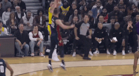 东契奇投篮结束后,踩到了地板与场边的沟里...