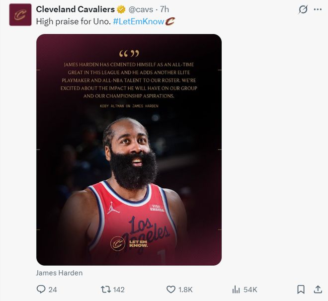 克利夫兰骑士也在7个小时前连续发了多条推文来欢迎36岁的大胡子,本赛季的大胡子依旧是NBA历史级的托底超巨。