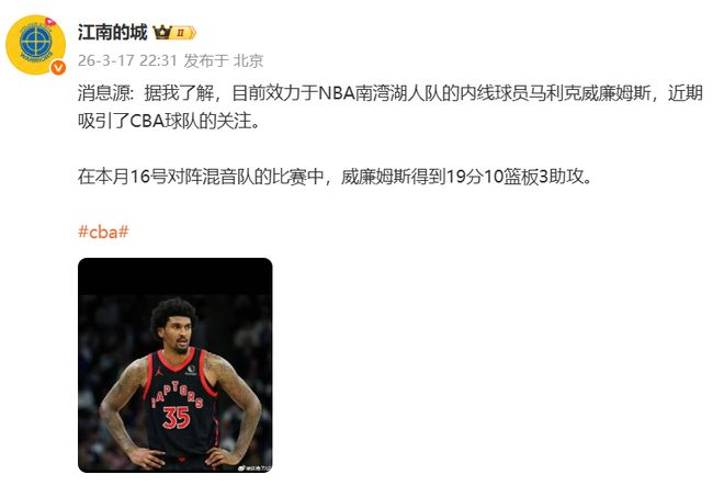 在广东和新疆的比赛结束后,和外援经纪公司有合作的媒体人“江南的城”爆出了一条猛料:目前效力于NBA南湾湖人队的内线球员马利克威廉姆斯,近期吸引了CBA球队的关注。