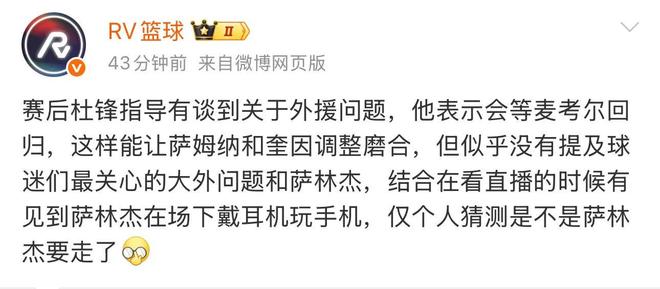 关于萨林杰的去留问题,杜锋并没有谈,不过有媒体爆料,广东宏远可能会裁掉萨林杰。
