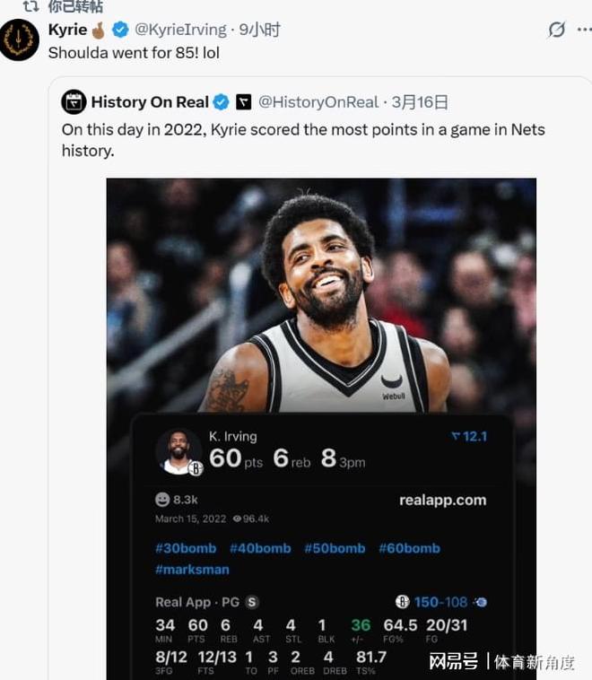 还有一则新闻,乍一看简直像AI杜撰出来的。就在今早,欧文突然在自己的社交媒体上转发了一条四年前自己砍下60+得分的比赛视频。那是在2022年3月16日,当时欧文还是篮网队的一员,在面对魔术队的比赛中,他狂砍60分,还投进8个三分球,摘下6个篮板,这一得分也创下了他个人单场得分的新高。