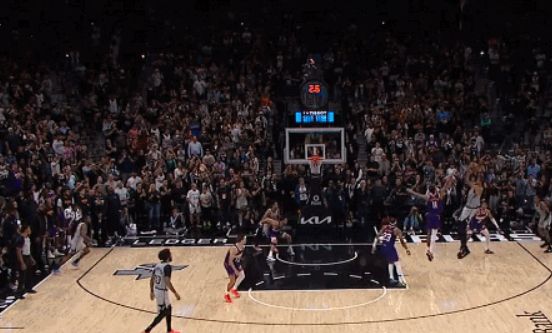 距离比赛结束约11秒,马刺落后1分,文班亚马并没有急着出手拒绝留给对手反扑时间,最终2米24的他用急停后仰跳投准压哨绝杀太阳,带领马刺101-100捍卫主场,此役其独揽34分12板两双数据。