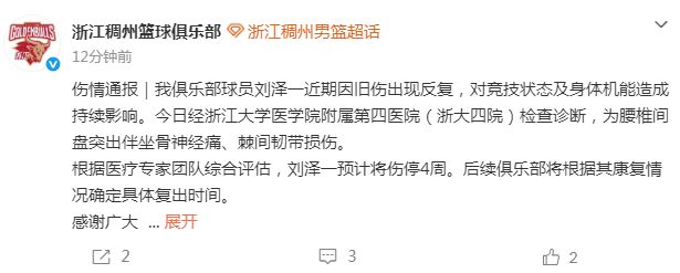 浙江男篮官宣:顶薪刘泽一腰椎间盘突出伴坐骨神经痛 伤停4周-NBA直播