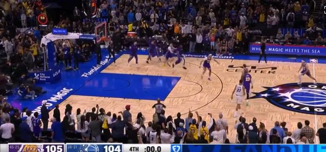 比赛最后2.6秒,落后两分的湖人获得球权,魔术漏掉了最准的肯纳德,后者在大空位接到皮球,三分轰进绝杀。