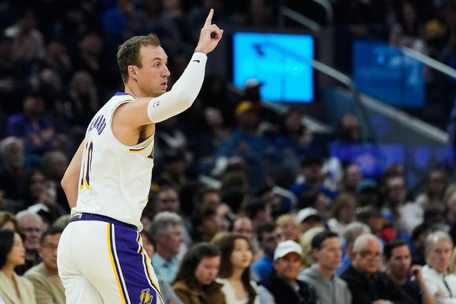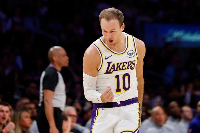 东契奇也冲了过来,湖人三巨头众星拱月一般将肯纳德围在中央,也让这位三分射手激动不已。