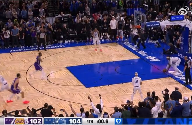 此时,比赛还剩下0.6秒,魔术最后一投不中,比赛到点结束。