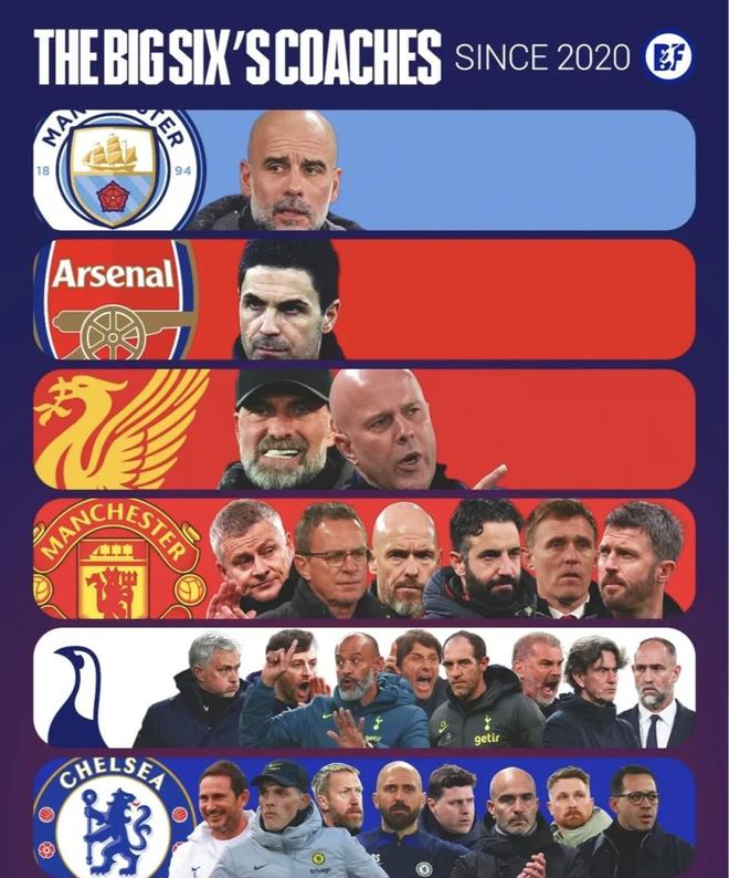 最近有媒体整理了英超六大豪门自2020年以来的主教练榜单。放在同一张图里看,反差确实很明显:曼城和阿森纳这边,名单几乎没怎么变,利物浦也只是完成了一次交接;曼联、热刺和切尔西这边,主教练名字却越排越长。同样都是豪门,为什么有的球队多年都能稳住帅位,有的球队却总在不断换人?